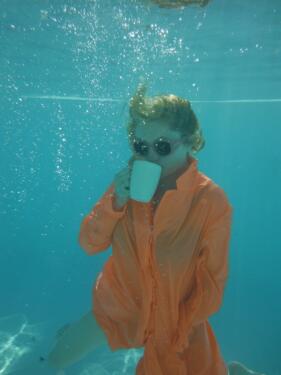 Alison Goldfrapp drinks tea underwater. Copyright, Alison Goldfrapp.